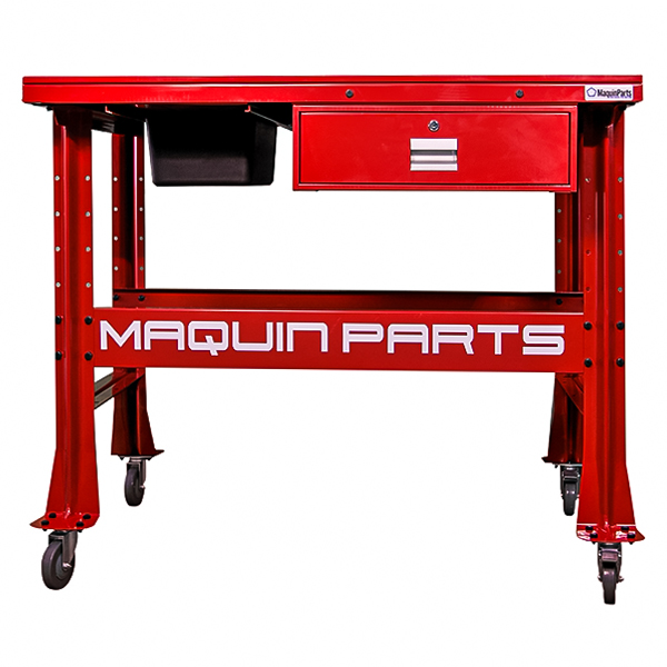 El banco móvil de trabajo nace en respuesta a la demanda de una mesa para trabajo en reparaciones de componentes en talleres mecánicos. Cuenta con la geometría necesaria para escurrir piezas sin derramar líquidos por los bordes, ya que cuenta con rejilla y bandeja recolectora. Posee frenos de ruedas, que le otorgan la seguridad ideal durante el trabajo y cajón porta herramientas.