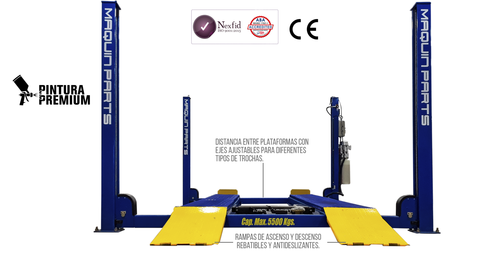 Columnas construidas en chapa de acero estampada de 3,2 mm de espesor. Bases fabricadas en chapa de acero reforzado de 8 mm de espesor. Plataforma confeccionada en chapa de acero de 3/16'' (5 mm) de espesor.